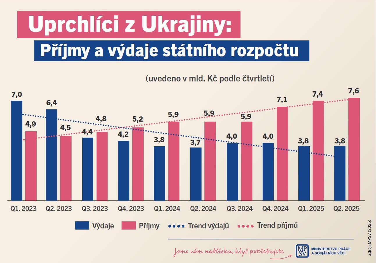 Nová data potvrzují dosavadní trend. Příjmy státního rozpočtu spojené s pomocí válkou zasažené Ukrajině nadále rostou. Ve druhém čtvrtletí letošního roku byly modelované příjmy zhruba dvojnásobné oproti výdajům, takže rozpočet skončil „v plusu“ přibližně 3,8 miliardy korun. V červenci letošního roku bylo evidováno téměř 170 tisíc pracovněprávních vztahů mezi uprchlíky.